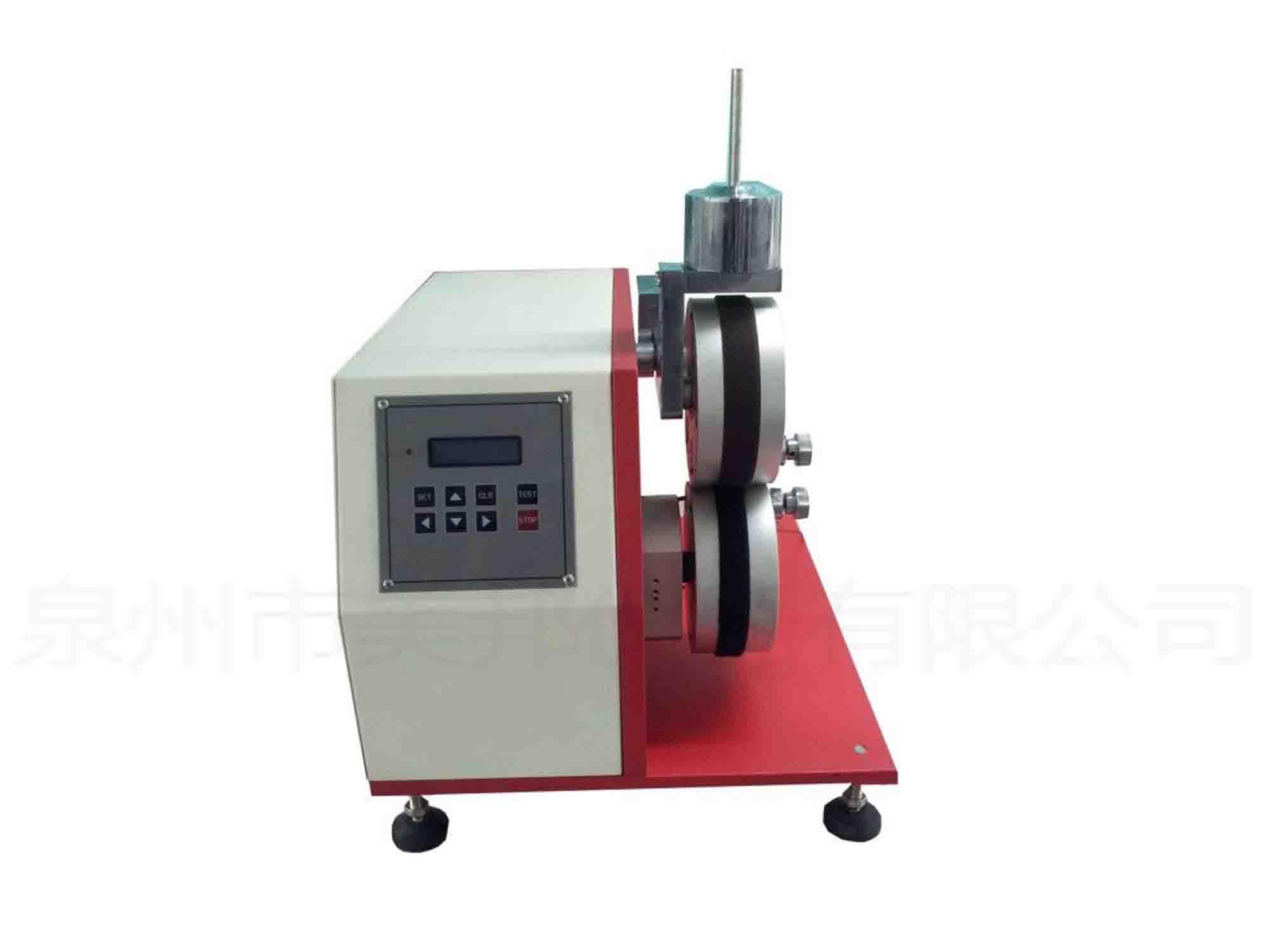 本機是用來測試黏扣帶(魔術貼)在經(jīng)過若干次的黏貼及剝離動作后,是否仍具有緊密黏扣的特質(zhì)。測試時,先以機臺做一定次數(shù)的黏及剝離動作,然后取下試件,截成75×20mm的尺寸,冰以輾壓滾輾壓試件,再利用拉力機求其黏貼力與黏貼強度。