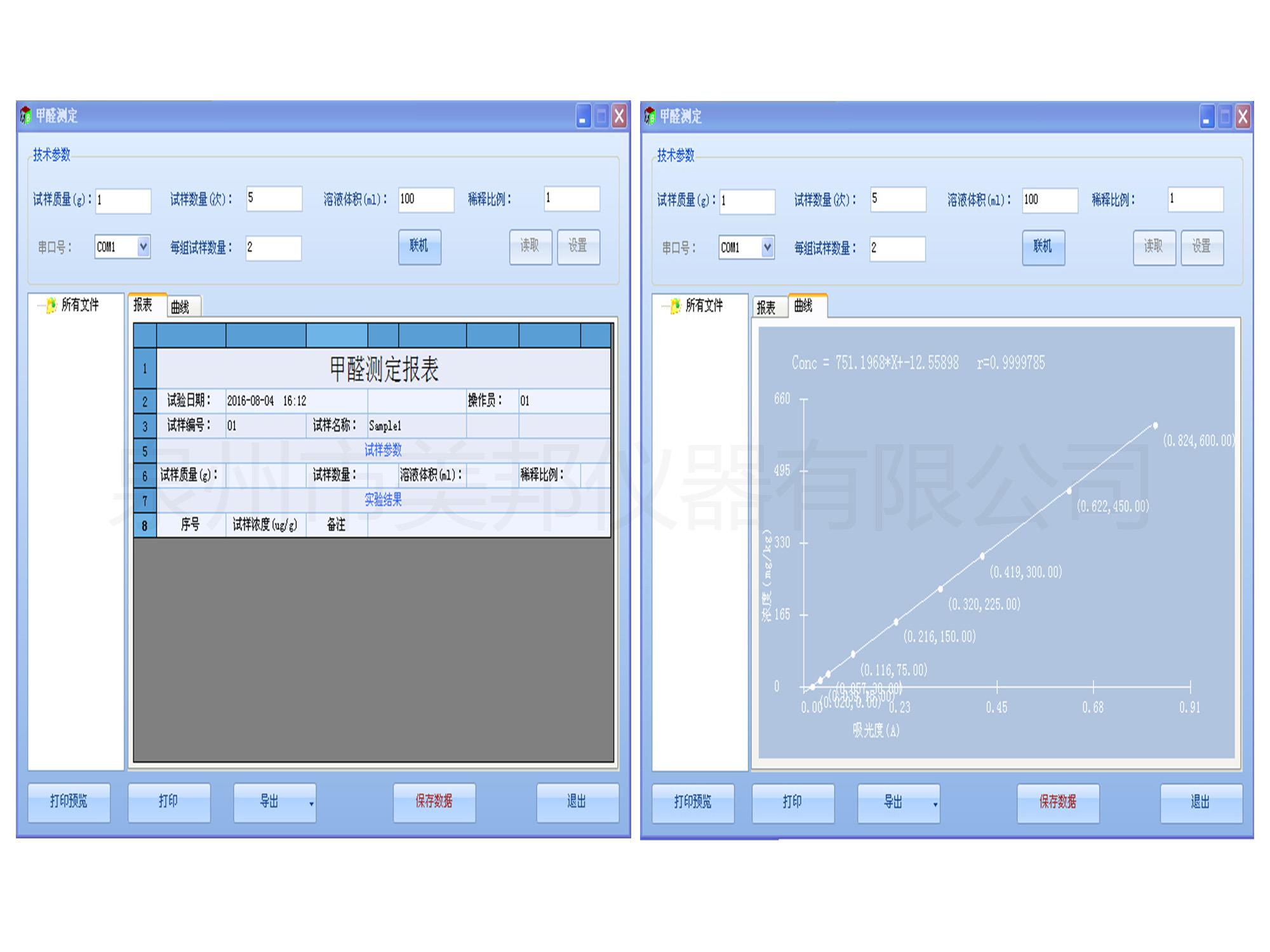 1、采用萃取法,按照國家標準方法可同時測出甲醛測定值、吸光度值和透過率值。